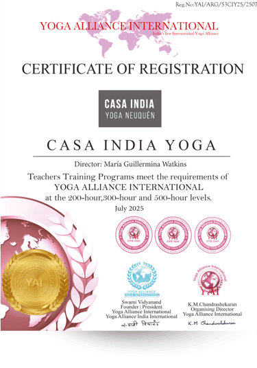 Certificado avalado por Casa India Yoga y Yoga Alliance India
